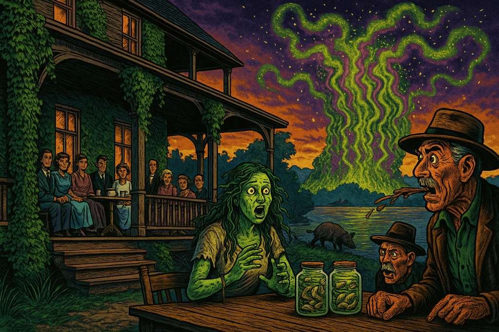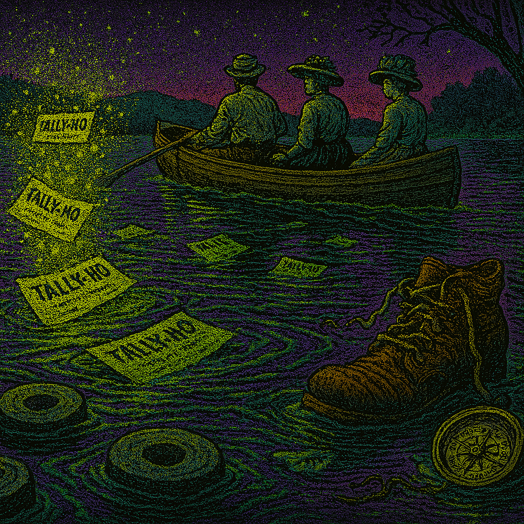 mrs thurbers jars of pickled nipper brine green as lantern glass lined the table pratt slapped his stack of unsold tally ho tickets down for luck the clock shivered froze 1111 something tugged tide on marrow my voice slid deep brook-cold steamboat landing beyond devils curtain waits the sky-rope keepers summon lamps guttered when they flared my chair sat lonely and outside oarlocks clacked where no skiff should drift
