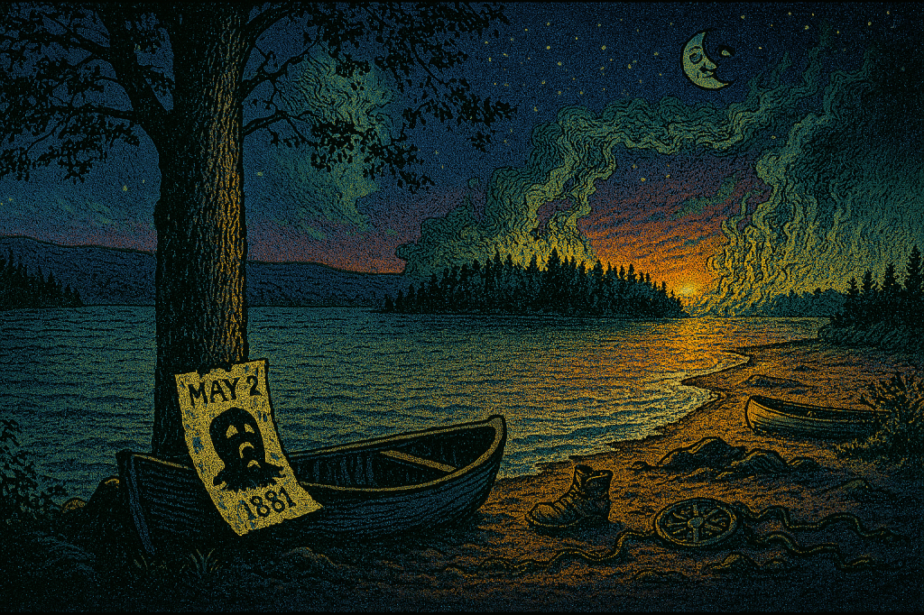beach watchers swore moon winked sky jolted fog wall shredded like old account books stove only evidence single boot washing ashore lace looped cracked sextant and my skiff coasting empty a calendar page plastered to the thwart may 2 1881 shadow silhouette nailed thereon mouth agape silent scream widening with sunrise folks now bar windows when devils curtain breathes after dark for if your profile looks thinner come morning youll know tallow jacks malone market stays open trading shadows for time and chateaugay lake keeps minutes dern slimy milfoil seaweed tendrils sky-rope lengths no mortal tape can measure