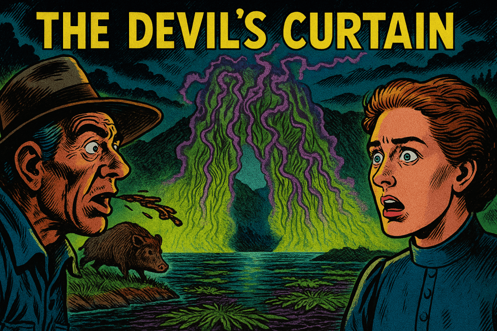 twilight upper lake spread pewter uncanny across the narrows hung the devils curtain weed-woven fog wall locals say was stitched by drowned loggers who never punched out it breathed slow inhale exhale each breath tolling inside me ribs like iron bell strokes caught in mason jar pratt spat chaw aint steer’n through that weed-rag no sir says he eyes wide as skillet bottoms by golly we wont i echoed though the lake in me pulled forward like salmon aching headwater