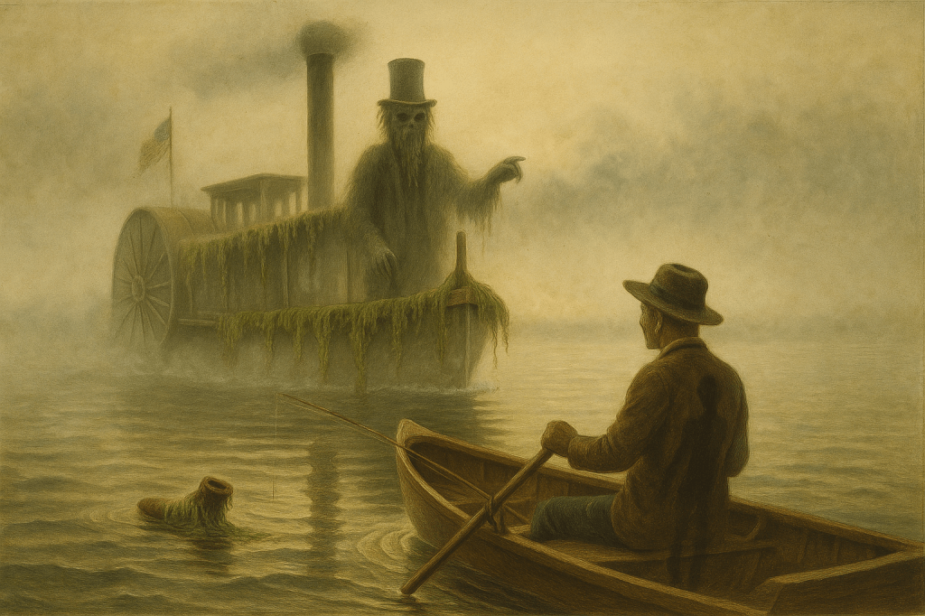 fog swallowed daylight paddlewheel thump slow ceremonial phantom steamer loomed deck slimed with milfoil seaweed algae bloom pearls pilot stood stovepipe tall empty eye pits sprouting spiral reeds he beckoned the lake clamped my gadway skiff still as pewter my shadow thin remnant unpeeled fluttered onto his deck like shot goose down the pilot turned the wheel water rippled clock ticks shadow thinned cigarette ash