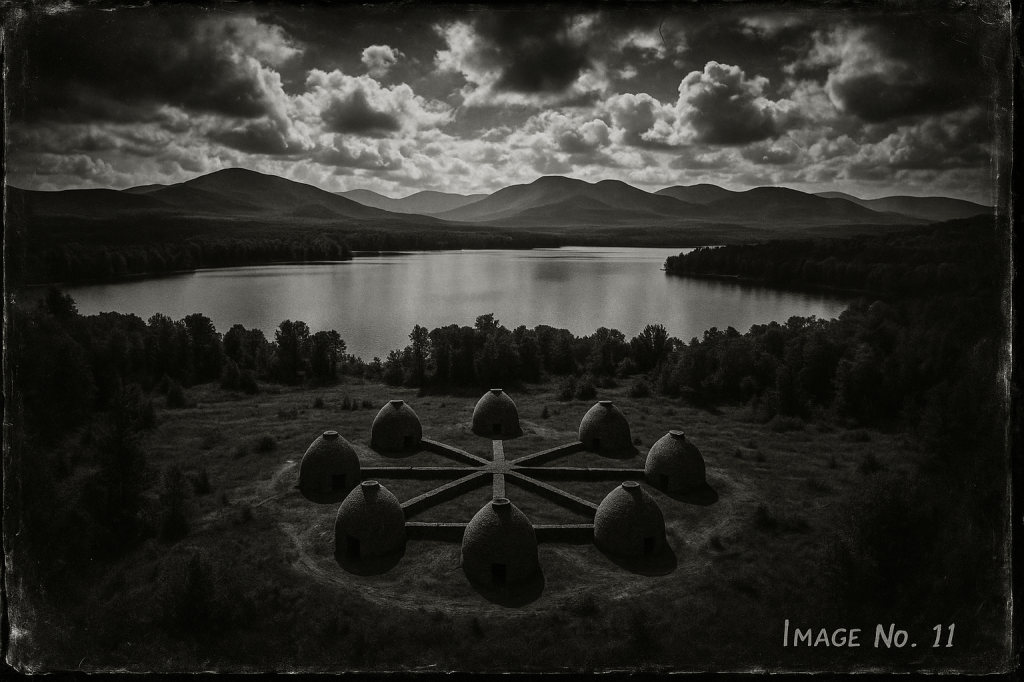 The team located moss‑cloaked stone arcs matching the supposed heptagram kiln ring, but ground‑penetrating radar returned “voids of indeterminate depth” beneath each locus. Surveyor Luke Sorrell sank a stainless probe six feet before it struck a cool cavity that exhaled balsam‑scented air—as if the kiln chambers still breathed. At lake‑edge, bathymetric scans confirmed a cribwork structure fourteen feet below present pool level—precisely where Jones’s Plate № 25 suggested. Timber samples, raised with grappling hooks, showed axe‑marks consistent with late‑1870s crib construction yet were coated in an anomalous verdigris sheen.