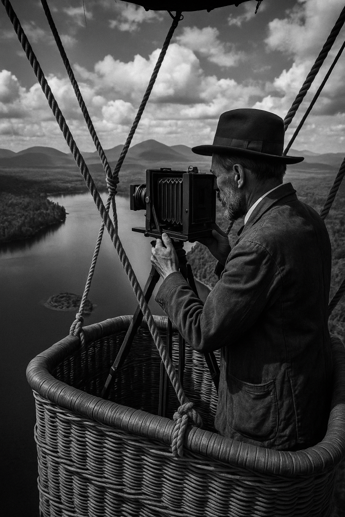 In the spring of 1901—two years before the Delaware & Hudson Company would absorb the Chateaugay enterprise—Smith M. Weed ordered a final synoptic inspection of his ore and timber domain. Ever the modernizer, Weed engaged Melvin D. Jones of Plattsburgh, an early practitioner of tethered‑balloon photography, to expose a suite of 8×10‑inch dry‑plate negatives over Lower and Upper Chateaugay Lakes. Though balloon surveys were still experimental, Jones’s plates captured a broad lattice of overlapping images, each one etched with the date, compass bearing, and altitude in a fine copperplate hand. Weed’s intention was practical—he sought a visual inventory of standing timber and charcoal kilns to buttress his asking price in negotiations with the Delaware & Hudson board. Yet the glass plates, boxed and forgotten when D&H took control in July 1903, came to light only in 2023 during an estate sale outside Plattsburgh.
