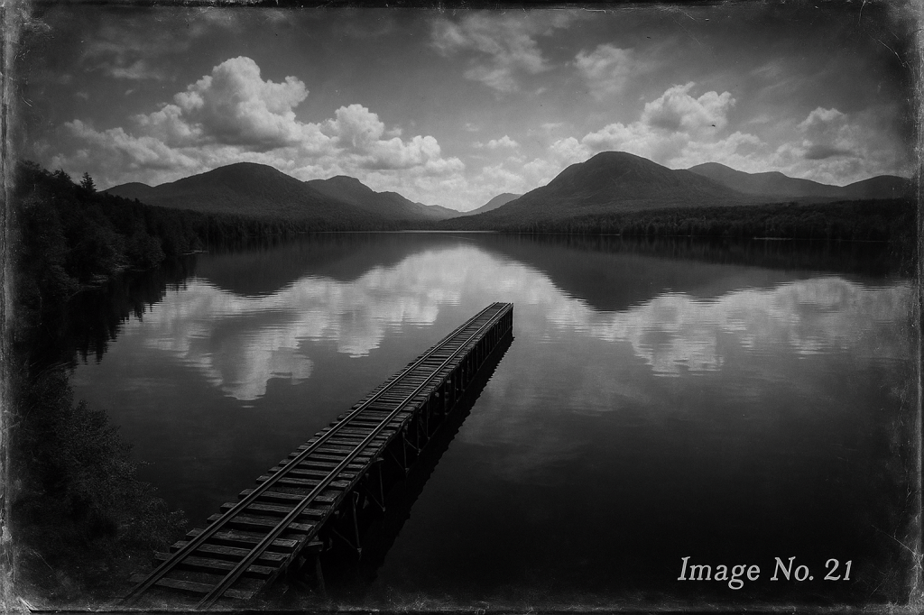 Their contents startled archivists. On Image № 14, just south‑west of Popeville, stands a circular kiln complex never shown on surveyor George Platt’s 1896 map: eight beehive kilns linked by masonry flues into a perfect heptagram—a design more alchemical than industrial. Plate № 21 reveals a narrow‑gauge spur running straight off the timber trestle and vanishing into the mirrored surface of Lower Chateaugay Lake, as though the track were laid for barges rather than locomotives. Most unsettling is Plate № 25: the faint shadow of a second timber crib‑and‑rock dam buried under water, half a mile below the known outlet dam, its angled spillway pointing not down‑river but east toward Figure Eight Mountain.
