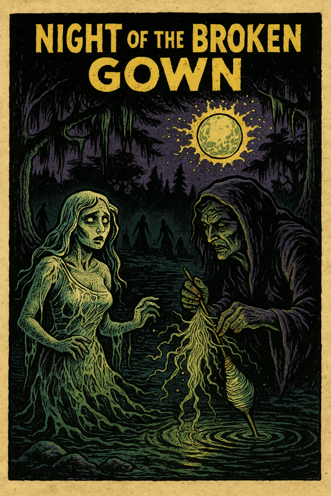 By New-Moon’s eve the gown hung limp on a warped rack, seams fracturing like cracked bone. The Moon slipped it on anyway—its fibers slurped flesh. She staggered, face puckered in the shapeless rags, a lantern-eyed horror drifting across marsh mud.