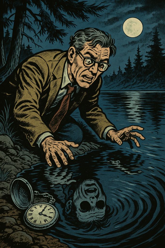 Dr. Tillinghurst, visiting from Troy, scoffed at their tales—until his reflection in the lake winked without eyes. He vanished next moonrise; all that floated back was his silver watch, snapped in two.