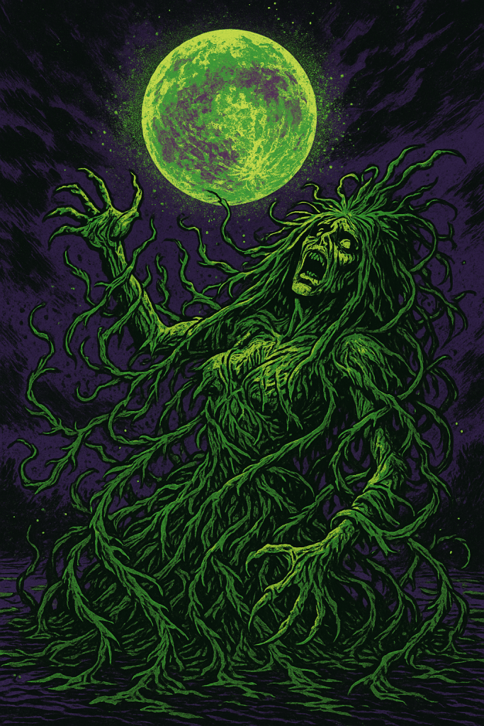 From the depths rose the Milfoil Queen, her hair tangled with hornwort and bone. She offered the Moon a savage swap: skin of living pond-green leaves, stitched with the sighs of lost girls.