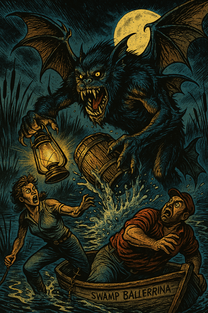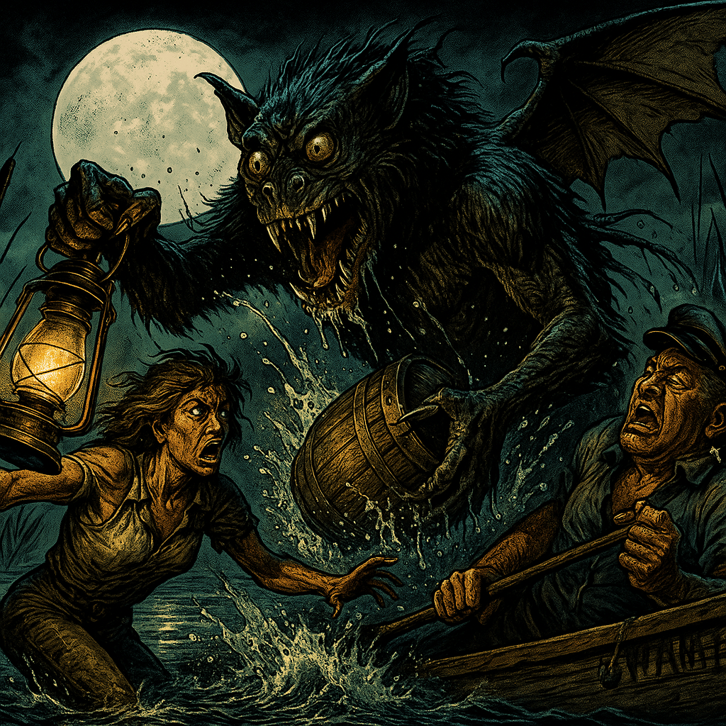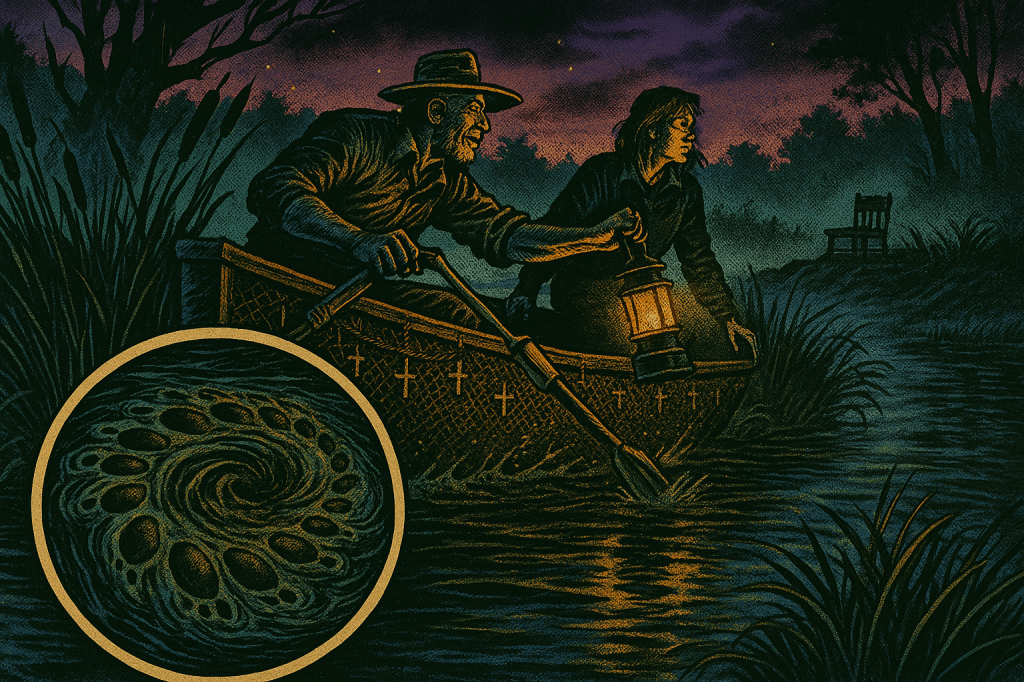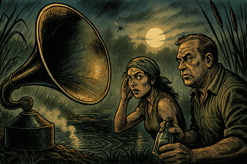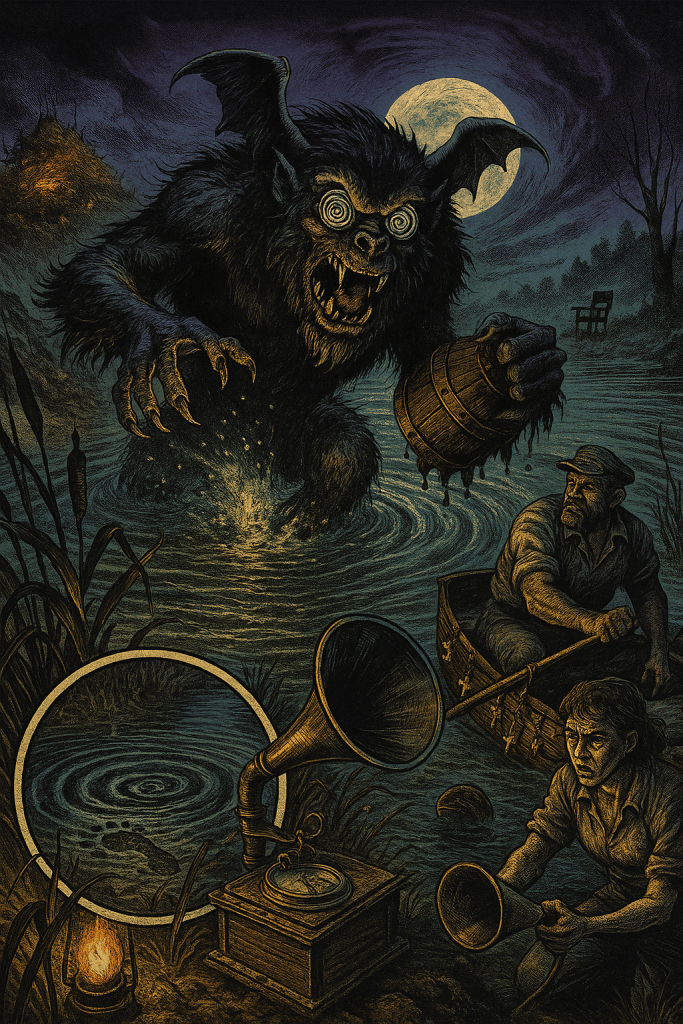 Friends anā neighbors, pull up close and mind yer boots, for weāve got a fresh-smoked earful straight out of the cattailsāHarlan Throop himself broadcasting live from that Crompville muck, where the old ironworks coughed their last and the water still sulks about it; this weekās sonic yarn follows Clary Vigneaultāthe last bog trapper worth the nameāand Ducey Nibbs, a river pirate with more neck than sense, as they take soundings of a sloshinā thing with too many eyes and a taste for moonshine, and I aināt one to gild the lily, but when the phonograph horn talks back in a manās own voice, youāll want a hand on the lantern and the other on your nerve. šā