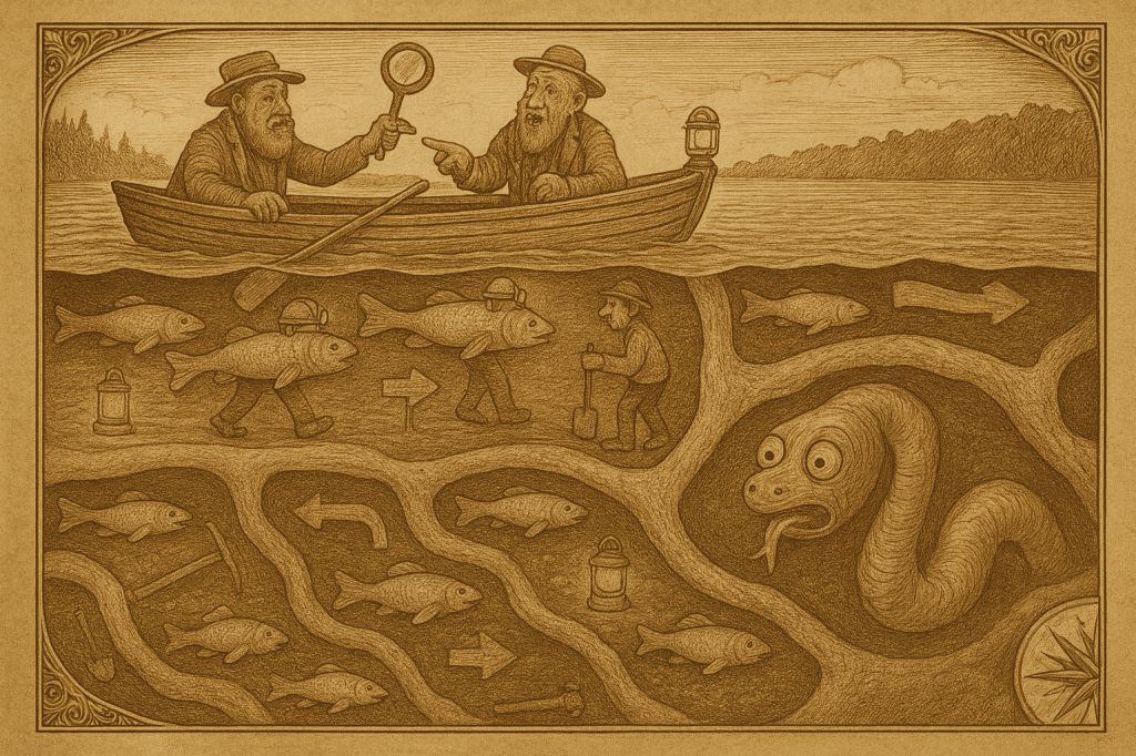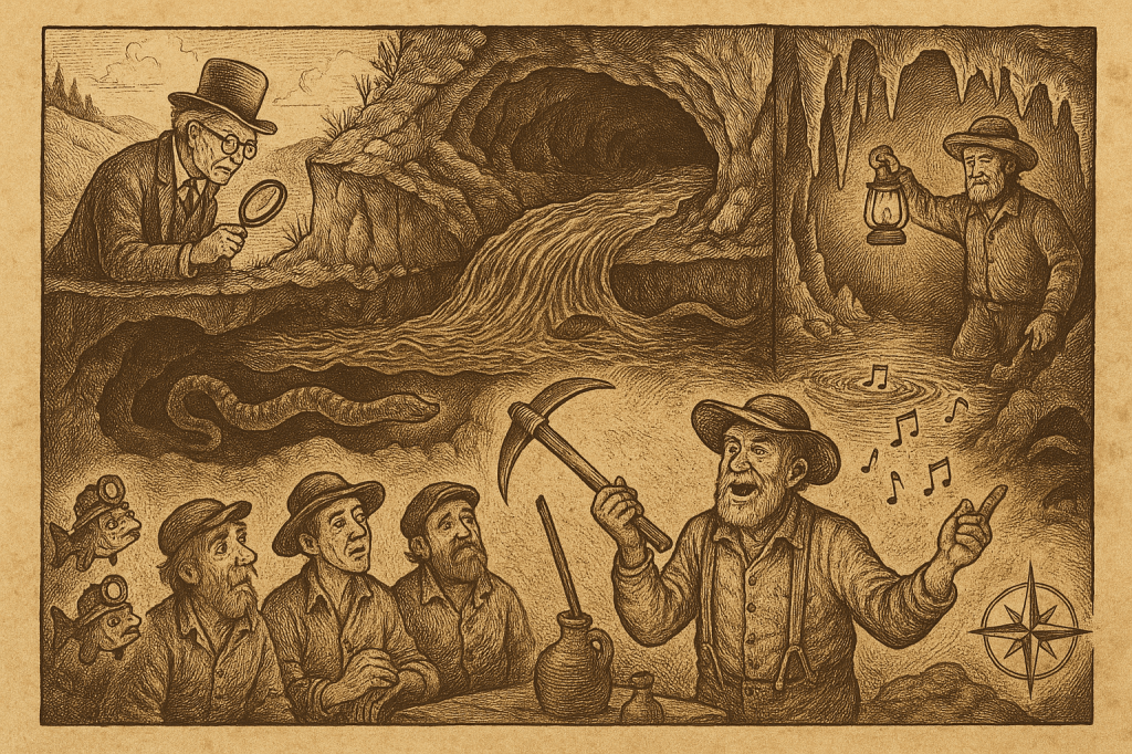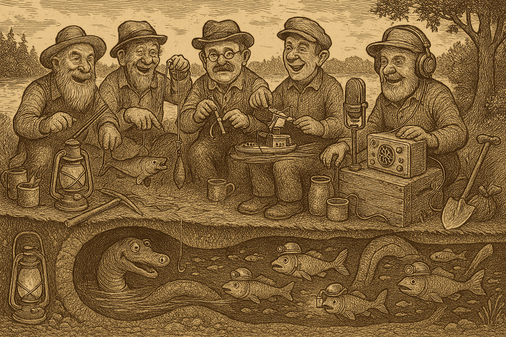 Youâll hear Dick talk plain on migratinâ suckers, a subcurrent thumpinâ under Little Lyon, and a keyhole at Bradley Pond that ainât so pondish after all. Thereâs a reenactment, tooâGeo. Cook & Jim Smith hookinâ fish what look bit from belowâplus a tidy historical rummage through tunnels that run faster than gossip at Merrillâs Landing. And if that ainât enough, Abner Percy chews a length of copper wire and reports the earth humminâ like a waspâs nest inside a church cello. đ§đśâđŤ