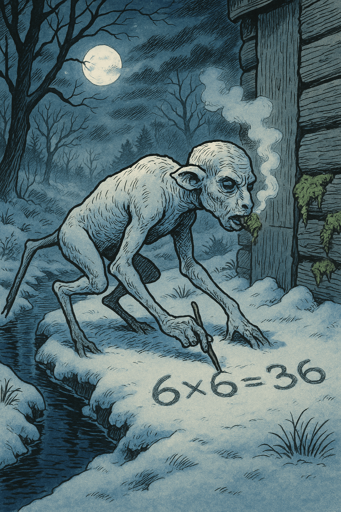 And while it mumbled, it chewed on the moss growing on the side of the icehouse like it was bubblegum. Nobody knew what it was, or why it was so obsessed with numbers. But folks started calling it the Mooncalf, ‘cause it only showed up when the moon was full and the mittens were missing.