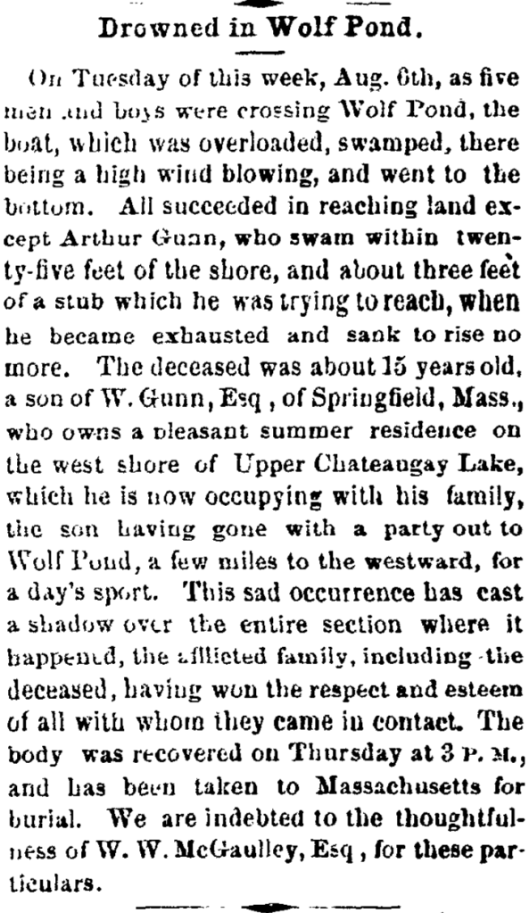 Scarcely had the afternoon begun to tilt westward when the boat gave a sudden lurch and yielded to the treacherous water. In the confusion that followed, four gained the shore with thankful hearts, but young Arthur Gunn, son of Mr. Wm. Gunn, Esq., of Springfield, Massachusetts, and a guest at his father’s comfortable summer house upon the western shore of Upper Chateaugay Lake, was not so fortunate. Only twenty-five feet from solid ground—three feet, it is said, from a friendly stub—he struggled manfully, yet the cold hand of the pond closed over him, and he sank from sight. The wind kept talking as though nothing had happened; the trees stood round like solemn witnesses too old to speak; the water kept its own counsel.