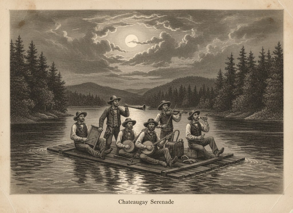 POPEVILLE, N.Y., 17 JULY 1894.—We have had many queer matters reported from the lake in our time, and some that would hardly be credited beyond the sound of our own church bell, yet a circumstance lately related concerning the Steamboat Pirates of Chateaugay is of so odd and diverting a nature that we venture to set it down for the benefit of such as take an interest in the uncommon accomplishments sometimes developed in out-of-the-way places.—It appears that on a recent evening, after one of those mishaps by which lake-faring gentlemen are at times separated from property more useful than ornamental, a company of these roving musicians, finding themselves recently suddenly deprived without their ordinary means of employment, undertook to make music from such articles as could be gathered from shore and deck, and in this wise produced what has since been called by some “Pirate Improvisation,” though whether the name will stand remains to be seen.